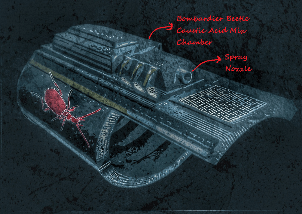 You’ll love the Bombardier Beetle spray! This is inspired by the dangerous Bombardier Beetle who sprays a noxious chemical compound called benzoquinone as a form of self-defense. To prevent its abdomen from burning up with this acidic chemical compound, the beetle mixes the reactants and heats them up in a special mixing chamber. It only becomes benzoquinone right before it shoots through the air, that’s some ingenious engineering! Your spray does the same. It mixes the reactants of a concentrated caustic acid in a special chamber right as you press the trigger then releases it seconds later. This should burn a hole in the hatch allowing you to break through!