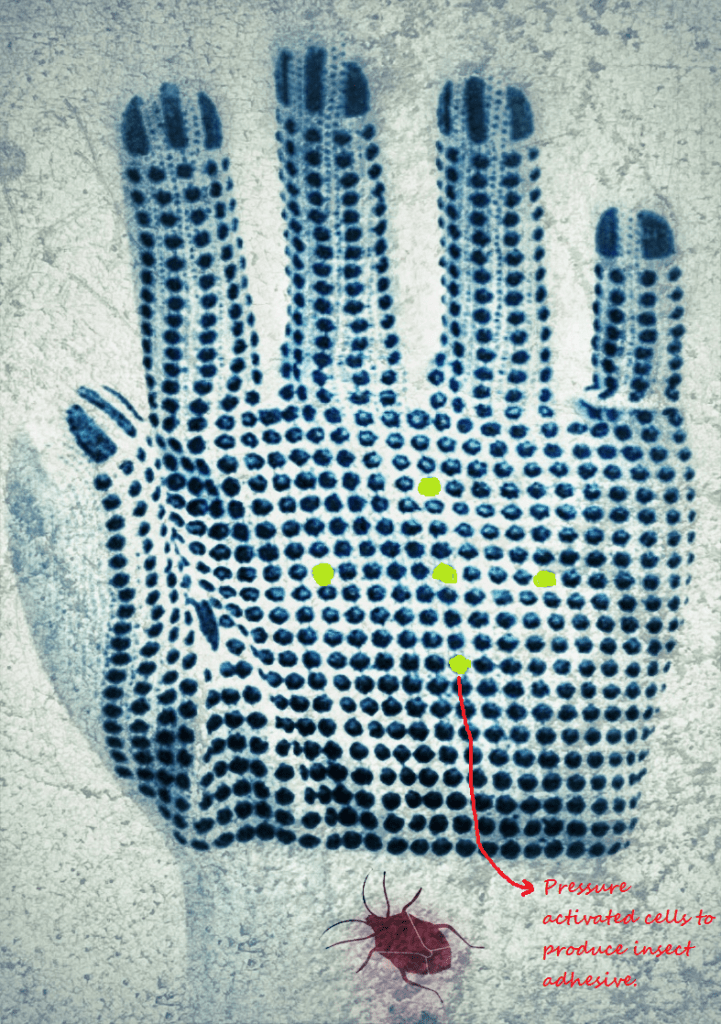 These sticky gloves are inspired by the unique chemical mixture from the Asparagus Beetle. This tiny beetle can lay its eggs on the underside of waxy asparagus leaves which remain there until they hatch or are dislodged by a force over 8,000 times the weight of the egg! In order to stick to waxy leaves, the beetle coats its eggs with a unique chemical mixture that combines with waxy surfaces to create a stronger bond than usual.
