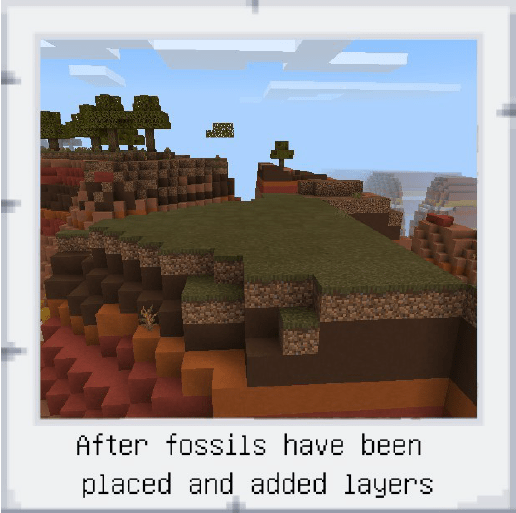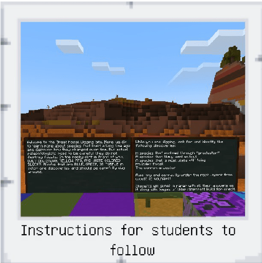 This Minecraft Build Challenge seeks to assess students’ knowledge and understanding of how scientists use the fossil record to support their reasoning of species changing over time. Scientists might look at groups of fossils and identify a ‘common ancestor’ based on similar fossil structures. Or scientists might hypothesize how a species evolved gradually over time (known as ‘gradualism’) or how a species evolved abruptly and remained unchanging for a long period of time (known as ‘punctuated equilibrium’). Or scientists might determine how a species went extinct based on the rock layers the fossils were found in or based on other species that lived nearby. There are many fun and interesting hypotheses that arise from building a unique fossil record for someone to dig up and interpret. Here’s how this Minecraft Build Challenge works: